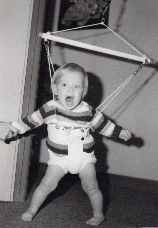 Jean-Yves (one year old) is learning to stay on his legs (January 1972, Sèvres, near Paris).