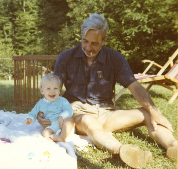 Jean-Yves (9 months old) with his grand-dad (Simone’s father) in the family chalet (Lépin le lac, French Alps, August 1971).