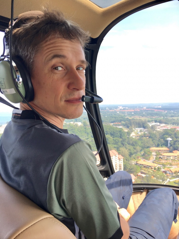 Jean-Yves in flight in the Robinson R44 helicopter above Lexis Hibiscus (Port Dickson, 7th January 2017).