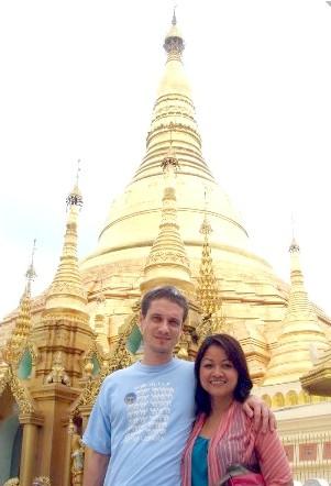 Jean-Yves et Kanda devant le « Shwedagon » (grand stupa) a Rangoon (Birmanie, 21 juin 2009).