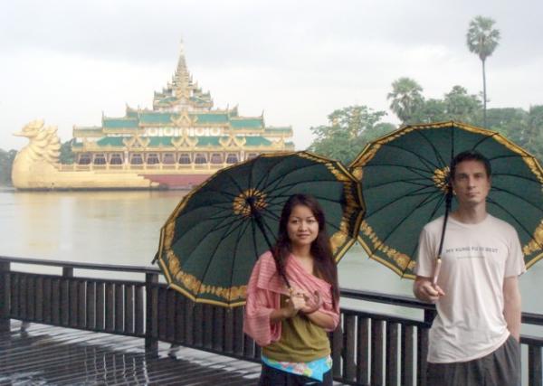 Jean-Yves and Kanda stroll along the lake near the hotel at Rangoon (Burma, June 2009).