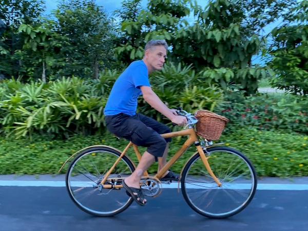 Jean-Yves on a bike in the « One & Only » hotel (Desaru Coast, 27th September 2020).