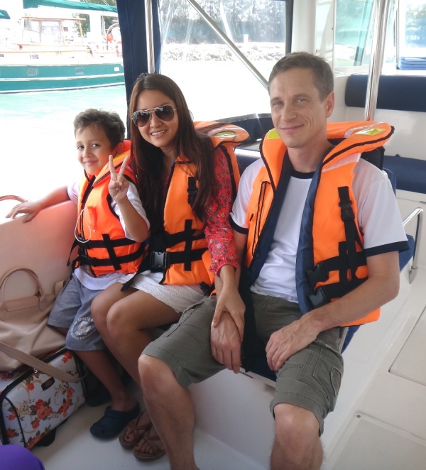 Jean-Yves, Kanda & Sylvain in the boat which brought us to Pangkor Laut (11th April 2015, Malaysia).