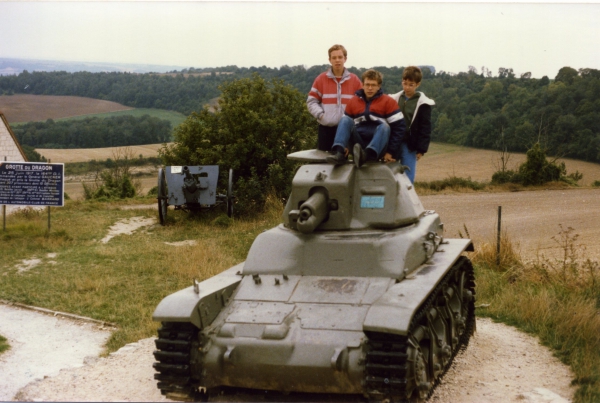 Jean-Yves, Nicolas et Stéphane sur un char d’assaut de la 2ème guerre mondiale à côté de la grotte du Dragon (chemin des Dames, été 1986).