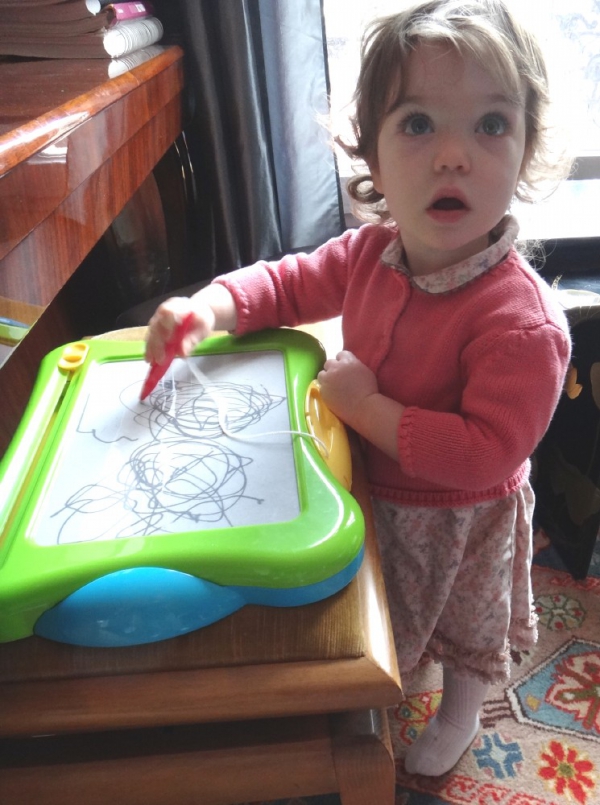 Joséphine dessine un escargot sur son ardoise magique (Paris, boulevard Lefebvre, 18 janvier 2015).
