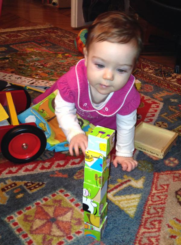 Joséphine n’a qu’une envie : faire tomber la pyramide de cubes (Paris, Blvd Lefebvre, 7 janvier 2014) !