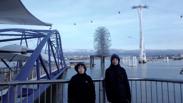 Julien & daniel devant la jetée (et le téléphérique) du bateau navette de retour à Londres (16 février 2016).
