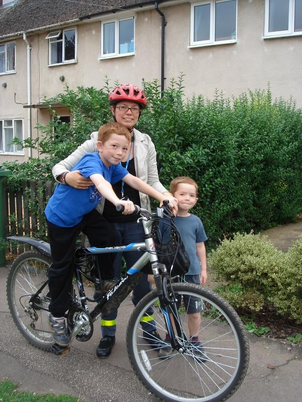 Julien est monte sur le velo de sa maman (Foster road, Cambridge, aout 2008).
