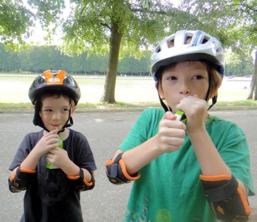 Julien & Daniel drink a fruit juice after riding on bikes in the park of Versailles (1st August 2010).