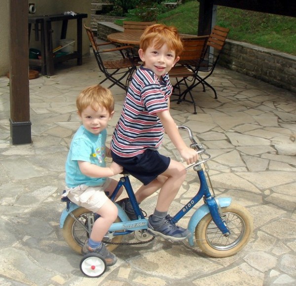 Julien et Daniel font du vélo. C’est le vélo sur lequel Jean-Yves, Nicolas et Stéphane ont appris ! (L’Etang-la-Ville, août 2006).