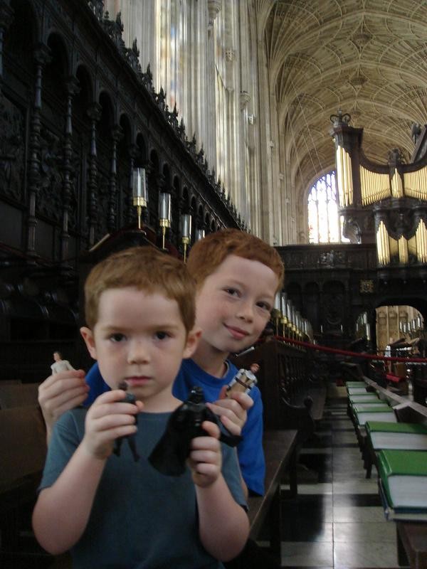 Julien et Daniel montrent leurs figurines ‘Star Wars’ dans la chapelle du King’s College a Cambridge (aout 2008) !
