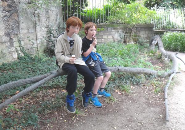 Julien et Daniel sont assis sur un faux arbre (métallique) dans le petit parc de la Fondation Cartier (Paris, 27 août 2013).
