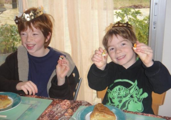 Julien et Daniel sont tous les deux des rois et nous montrent leurs fèves (janvier 2011) !
