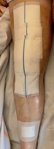 La jambe droite de Simone avec son pansement après l’opération (13 septembre 2017, Hôpital Mignot).
