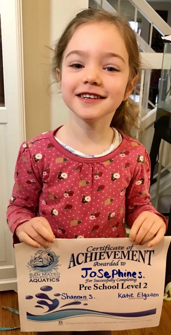 Le premier diplôme de natation de Joséphine (San Mateo, début novembre 2017) !