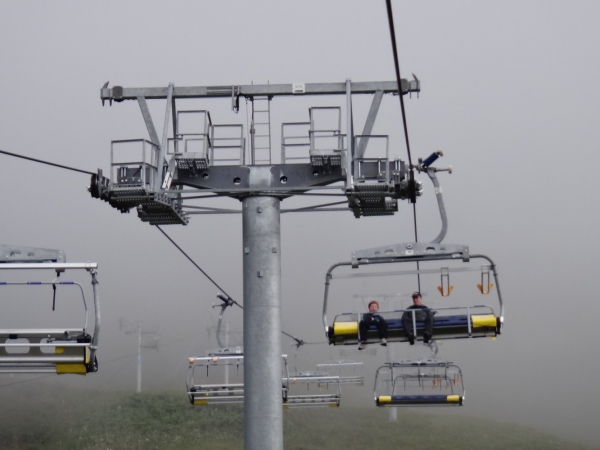 Nicolas et Daniel dans le brouillard sur le télésiège du Crêt du Loup (La Clusaz, 15 août 2014).