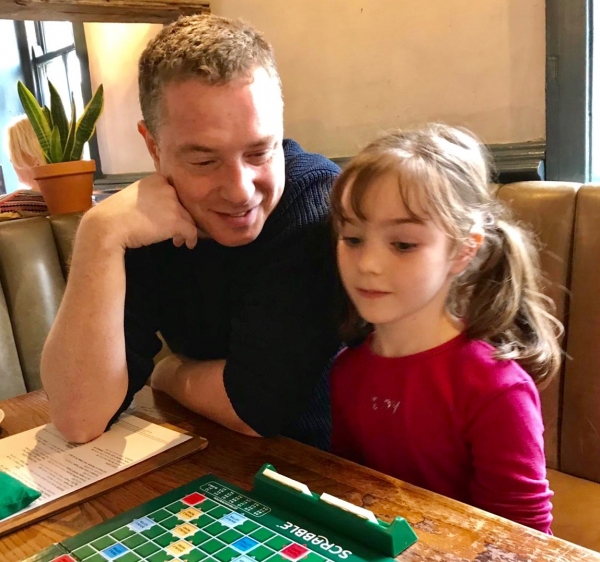 Nicolas et Joséphine jouent au Scrabble (dans un Pub de Cambridge, 28 avril 2019).