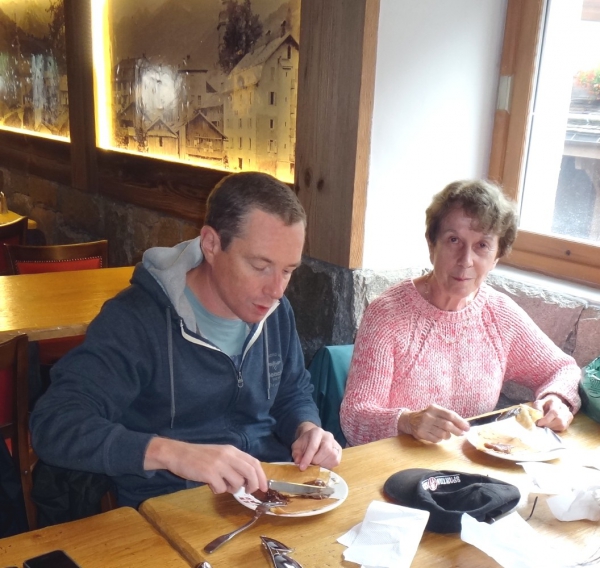 Nicolas et Simone se régalent de crêpes (La Clusaz, 15 août 2014).