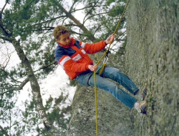 Nick is abseiling on a rock at Fontainebleau (Christmas 1986).