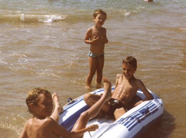 Nicolas, Jean-Yves et Stéphane à la plage de La Faute sur Mer (Vendée, août 1981) sur leur « Kidjet Nautico ».