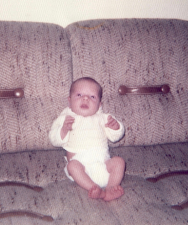 Nicolas, a few weeks after his birth, on our new settees (summer 1973, Ansdell, Lancs).