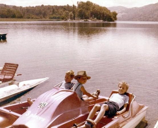 Nicolas, Stéphane and Jean-Yves go out on a pedal-boat on a lake (« Massif Central », centre of France, summer 1979).