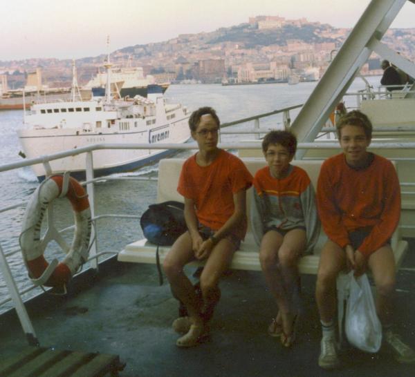 We are leaving the Palerme harbour. Jean-Yves has stiches on the forehead ! (Sicily, August 1987).
