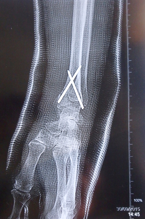 Radio of Simone’s broken wrist (through the plaster) after her surgery operation. The two pins are cleary seen (30th September 2015).