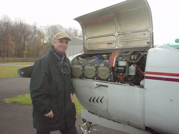 Ron is checking the oil level of his Bonanza engine before a flight (19th November 2000).