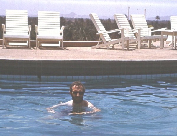 Serge, in the swimming pool of an hôtel in the south of Morocco (during our travel with Jean-Louis & Noëlle in August 1971).