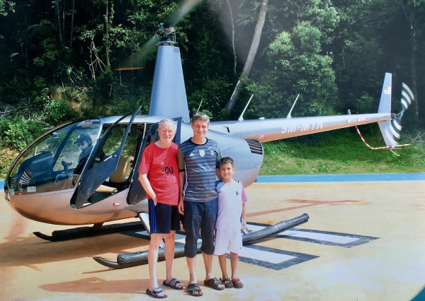 Serge, Jean-Yves et Sylvain devant l’hélicoptère Robinson R44 avant un vol au dessus de Lexis Hibiscus (Port Dickson, 7 janvier 2017).