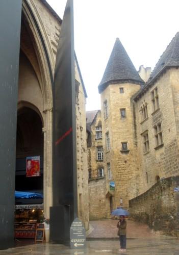 Simone devant la gigantesque porte du marché couvert de Sarlat (Périgord, avril 2009).