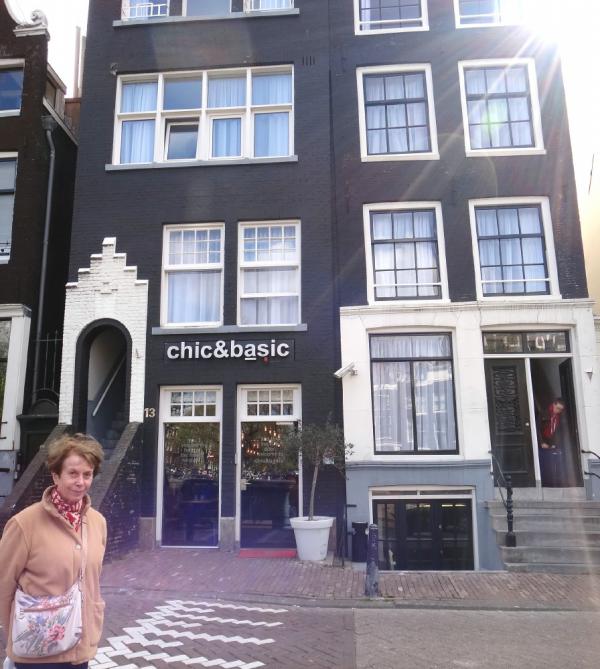 Simone in front of our hotel in Amsterdam, the « Chic and basic » which is on the Herengracht canal (April 2014).