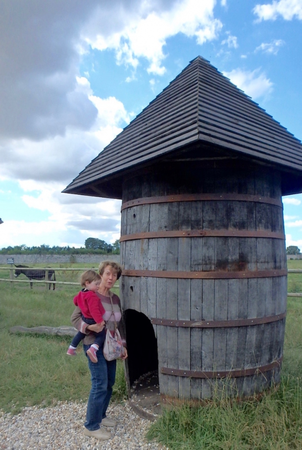 Simone shows to Éléonore a wooden hut (Ferme de Gally, 14 Juillet 2016).