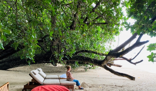 Simone sur la plage de notre hôtel : « Resort One and Only, Desaru Coast » (Malaisie, septembre 2020).
