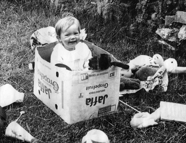 Baby Sonya ! About 1 year old, in the garden (in a box from "T. Snapes the butcher") in Bunker Street (Freckleton, 1974).