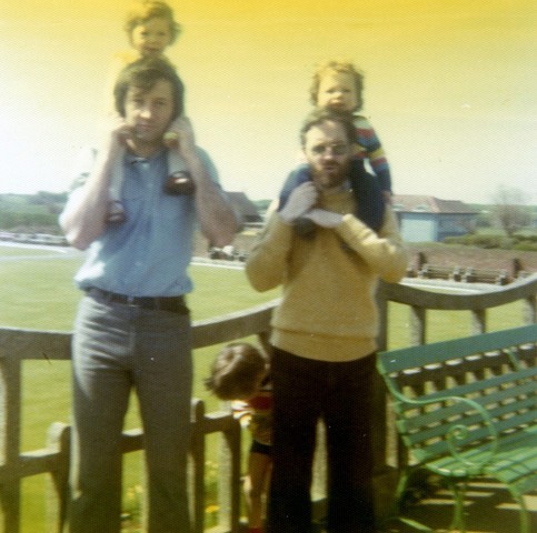 Sonya on Maurice's shoulders, Nicolas on Serge's shoulders (Lancashire, 1974)