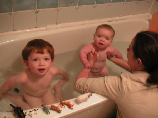 Sonya looks after Julien & Daniel in their bath (February 2004, Islington).