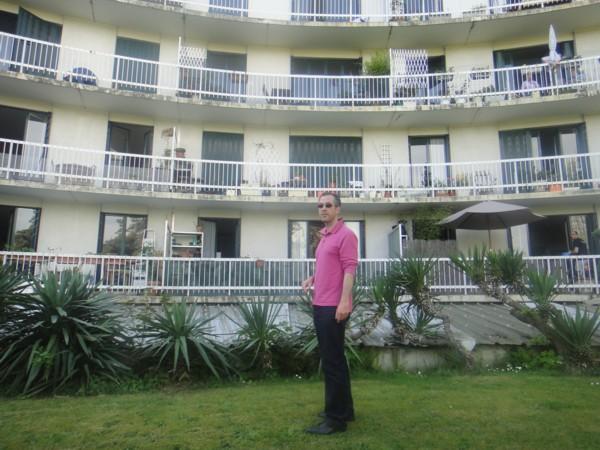 Stéphane visits our apartment building in which we lived in 1970, 71 & 72. This picture shows the back of the building, our apartment being the one on ground level just behind Stéphane (picture taken mid-april 2011).