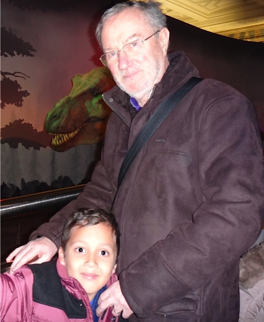 Sylvain et son Papy devant le T-Rex animé du musée d’Histoire Naturelle de Londres (06/02/2015).
