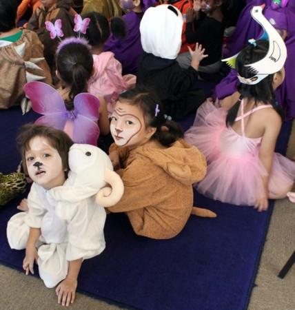 Vincent est en déguisé (en blanc sur la photo) dans une pièce de théâtre (pièce de fin d’année : « Dinosaurs and all that rubbish ») à son école (Nexus, Putajaya).