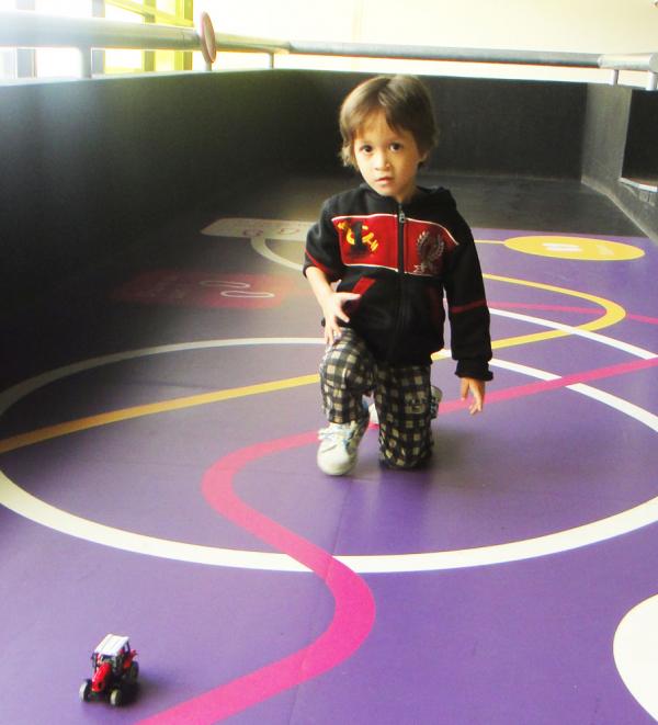 Vincent lance une voiture dans une pente à la Cité des Enfants (La Villette, 26 juillet 2011).
