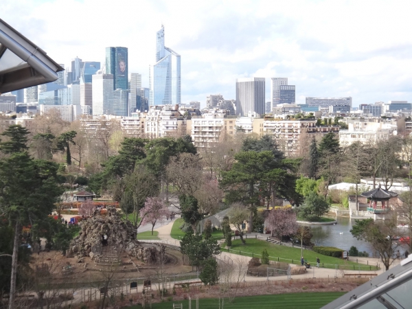 Vue depuis le haut de la Fondation Vuitton sur le jardin d’acclimatation et la Défense (mars 2015, Paris).